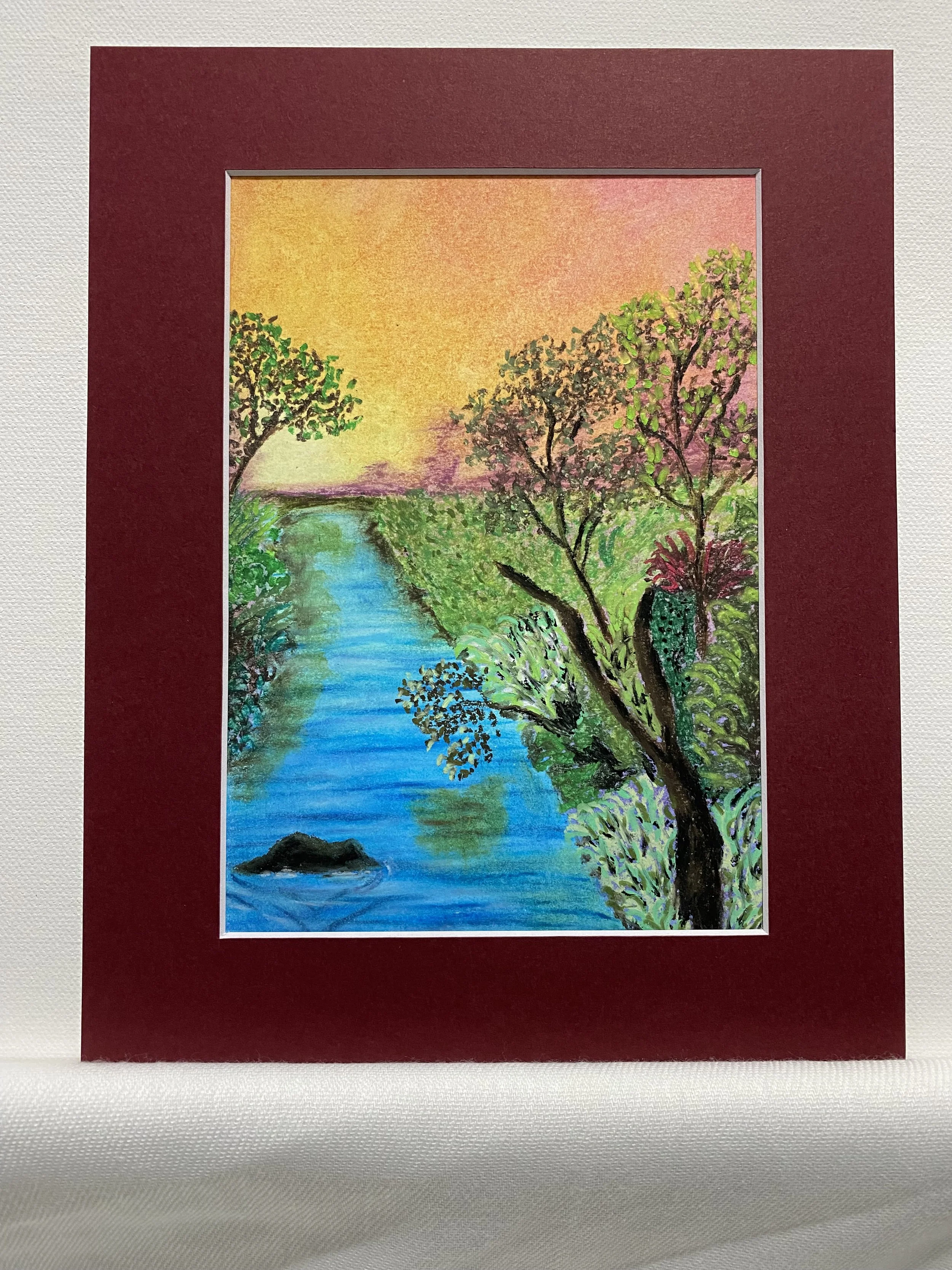 Sunset River Oil Pastel on paper Matted to fit 8" x 10" frame On display at Trellis & Vine
